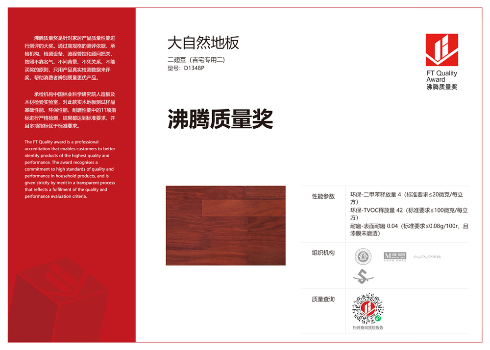 2021年9月28日,在由中国建筑装饰协会等单位指导,沸腾质量奖家居产品质量性能测评组委会主办,红星美凯龙、采筑电商平台共同协办,中国林业科学研究院人造板及木材检验实验室承检的2021沸腾质量奖实木地板质量性能测评中,大自然地板(二翅豆吉宅专用二,型号:D1348p)凭借优异的品质,获得“沸腾质量奖”,展现产品竞争实力。