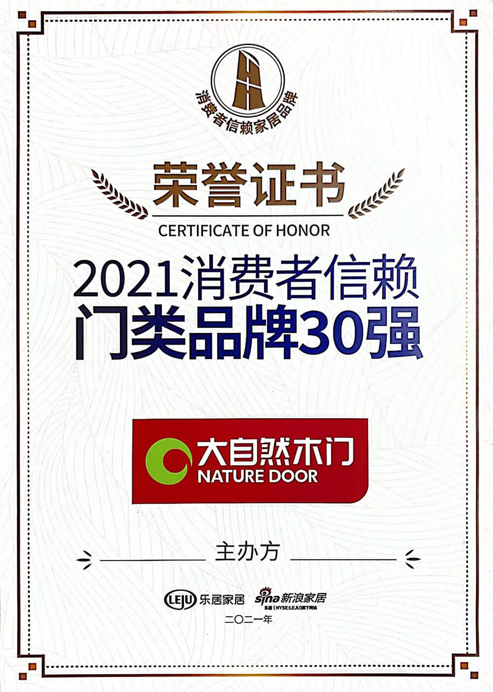 2021年12月18日,由乐居家居主办,新浪家居承办,CCTV·大国品牌、中国质量新闻网·家居、家页传媒、大国中居联合主办的『智见·2021中国家居新时代盛典暨金致奖颁奖典礼』于广东佛山盛大开幕。历经品类30强品牌评选、网络票选及专家评审等环节,榜单终于正式揭晓,大自然家居荣膺『智见·家居新时代』2021消费者信赖十大家居品牌以及2021年消费者信赖门类品牌30强双奖项。
